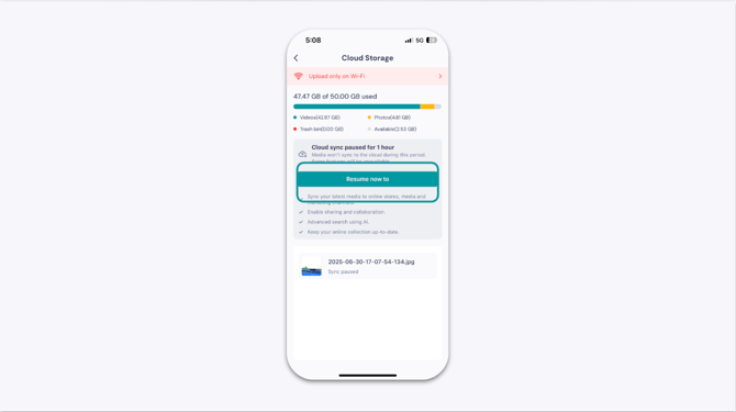 To resume the sync, simply tap on the Resume button to restart the sync again.